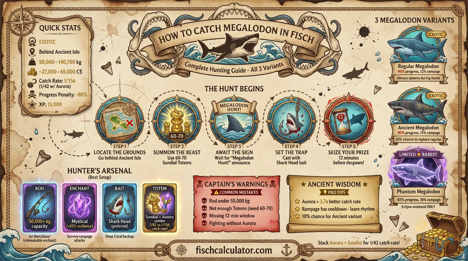 Step 1: Travel to Ancient Isle and position yourself behind the island. Step 2: Use Sundial Totems to trigger a Megalodon Hunt - expect to use 60-70 totems on average before one spawns. Step 3: When "Megalodon Hunt!" is announced server-wide, immediately cast with Shark Head bait. Step 4: Be ready for a brutal fight - the -80% progress penalty combined with rampage attacks means this will take several minutes. Step 5: You have exactly 12 minutes before the Megalodon despawns. If using Aurora Totem alongside, your catch rate improves significantly (1/42 vs 1/156).