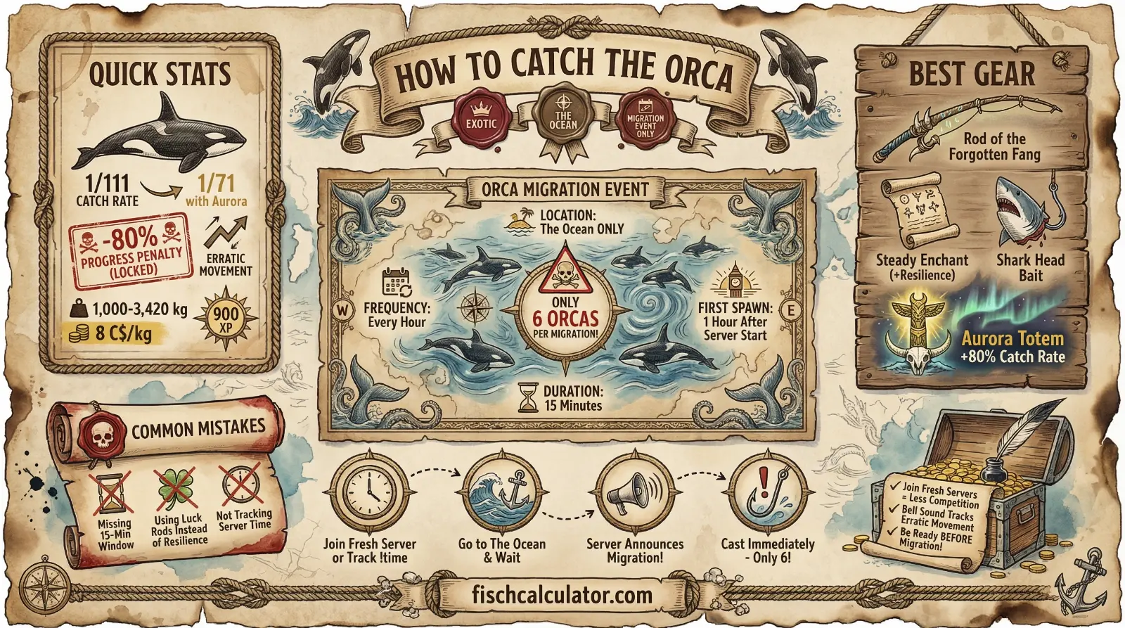 Step 1: Join a fresh server or track migration timing (hourly after the last migration ends). Step 2: Travel to The Ocean and position yourself before the migration starts. Step 3: When "Orca Migration" announcement appears, immediately cast with Shark Head bait. Step 4: Only 6 Orcas per migration - be fast! Step 5: Handle the -80% progress penalty and erratic movement carefully. Step 6: Use Aurora Borealis totem to improve catch rate from 1/111 to 1/71.